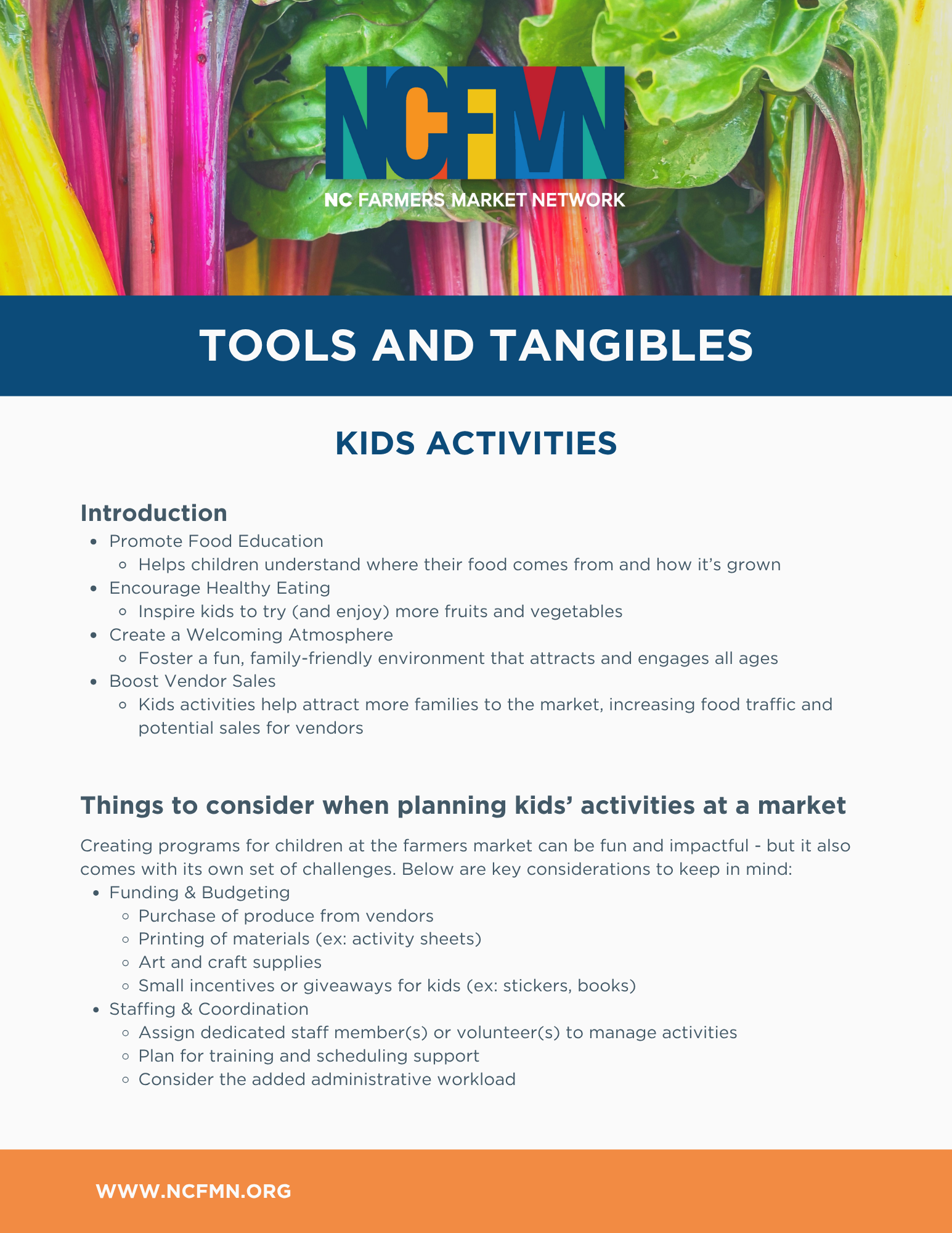 Need some ideas for adding a kid focused activity at your market? Here’s a great place to get started! Our newest Tools & Tangibles document is a great beginning resource for adding an interactive, kid friendly activity. Ranging from simple bingo cards or coloring sheets up to more involved things like planting seedlings or cooking demos, kids’ activities can be a great way to keep families coming back each week.